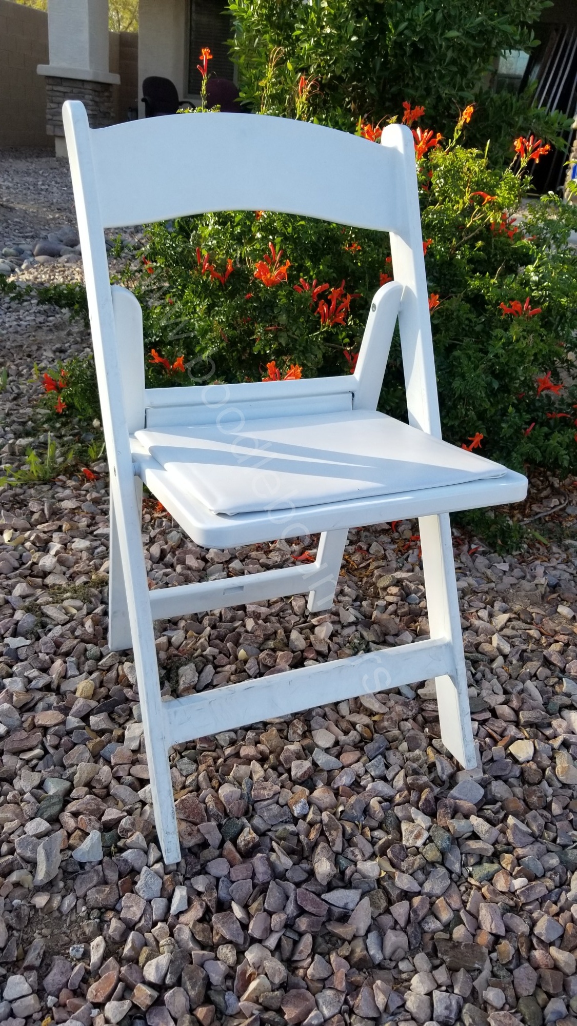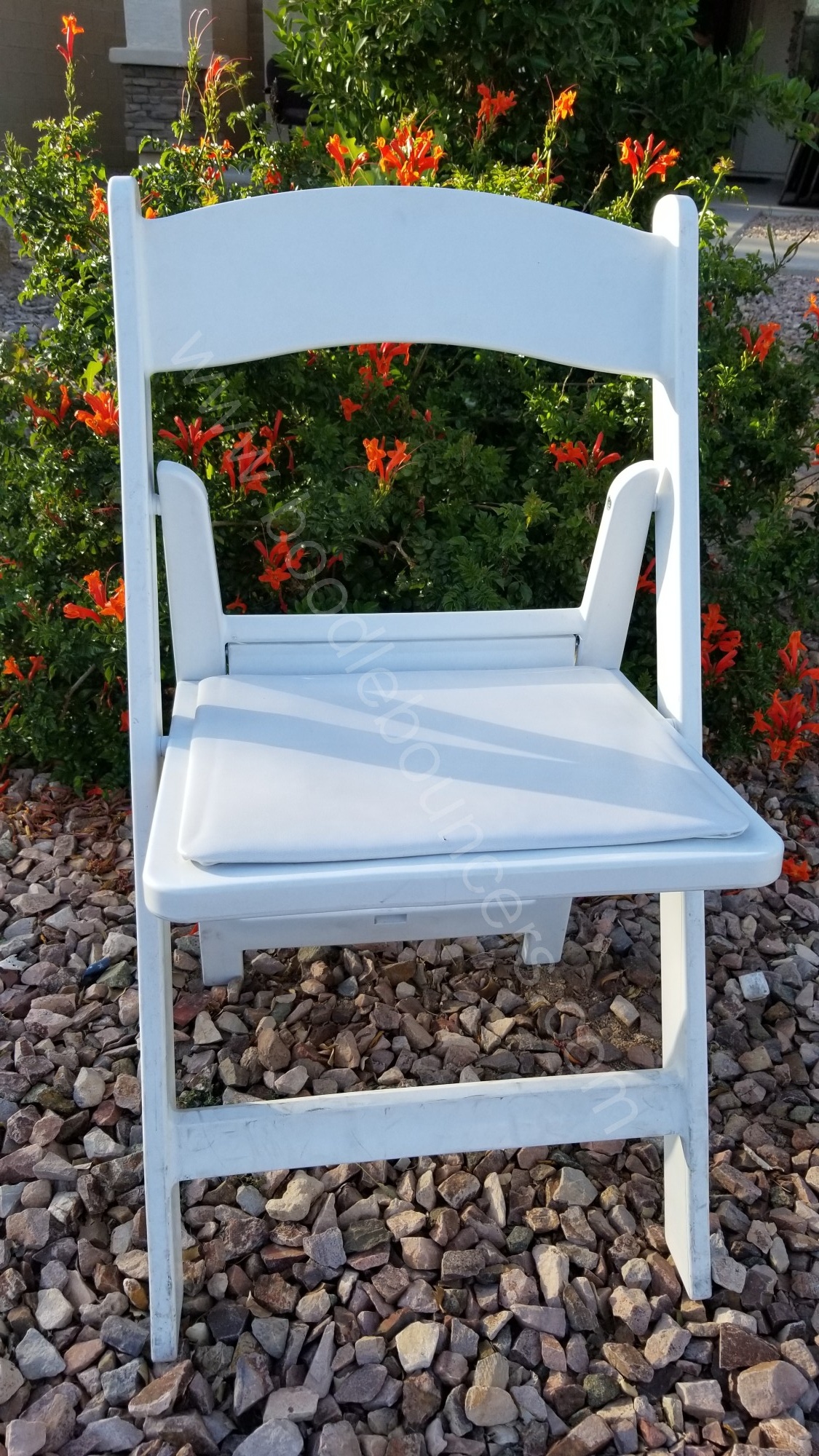 White resin chairs have padding seating allowing for additional comfort and eligance for any special occassion.