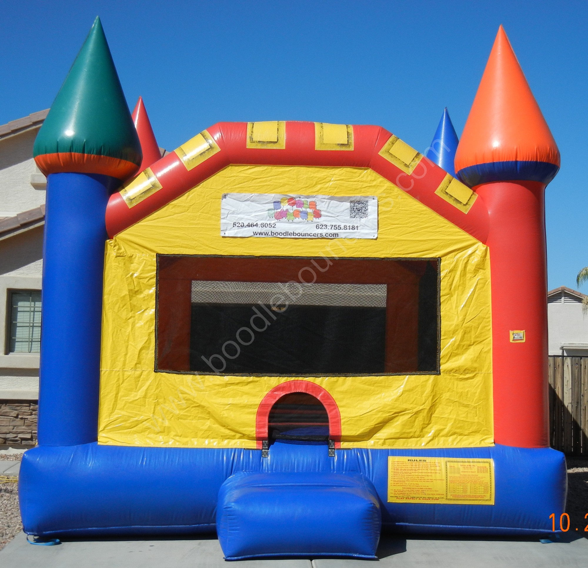 This Castle 2 moonwalk is 360-degrees of brilliant and joyful regal fun for all young royalty! This majestic moonwalk is fit for any king or queen, with colors of blue, green, red, yellow and orange, along with four tall spires to make any palatial party a success.
