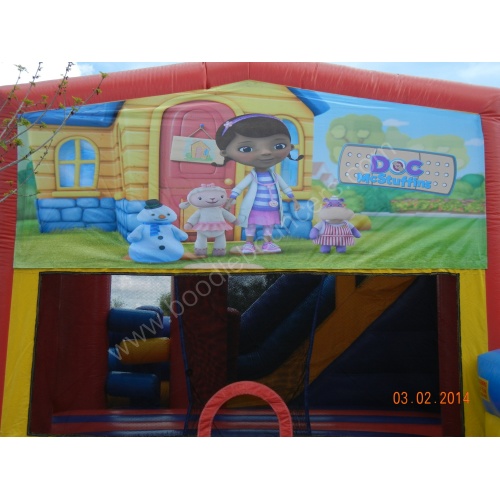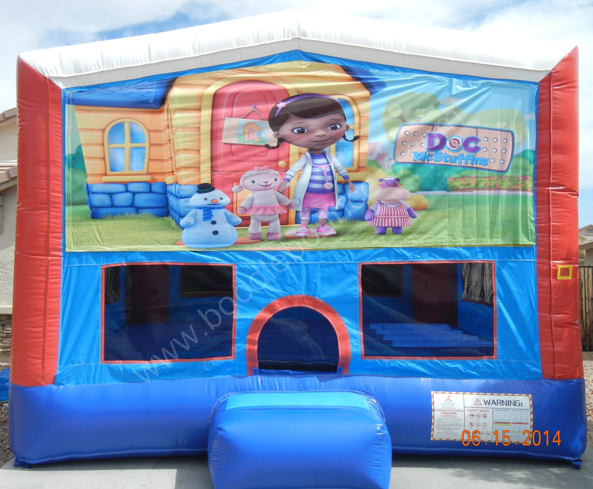 Come join Dottie "Doc" and her stuffed animal friends, Stuffy, Hallie, Lambie, and Chilly as they help all of their stuffed animal friends feel better. The Doc McStuffins Module House will put a smile on your face and make you feel better. Come on in and get your check-up with Doc. This 15x15 bounce house also comes with a basketball hoop and ball.