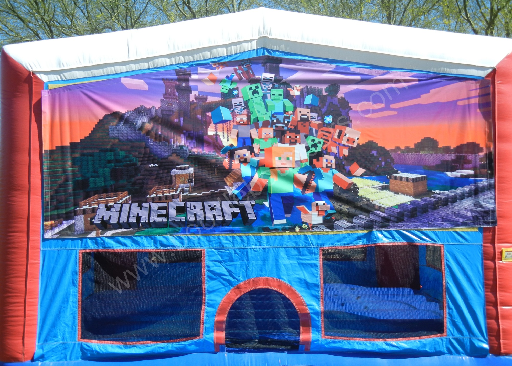 Steven, Wolf, Creeper, Blaze, Enterman and friends, are waiting for you to join their journey creating hours of epic fun in the Minecraft panel module house. This 15' x 15' module bounce house also comes with a basketball hoop adding hours of fun to your adventure.