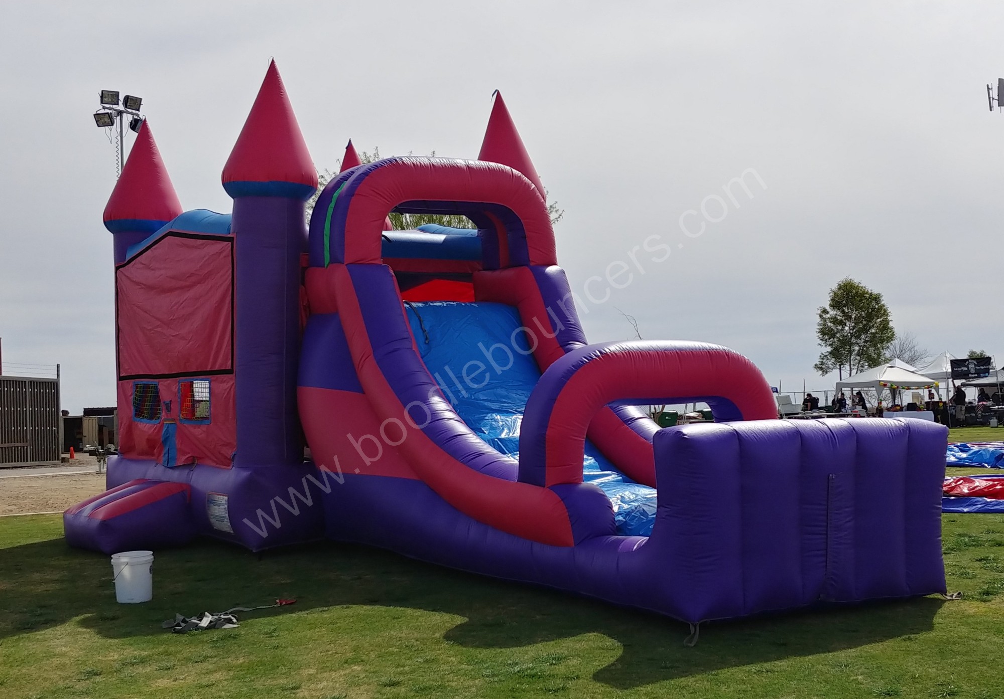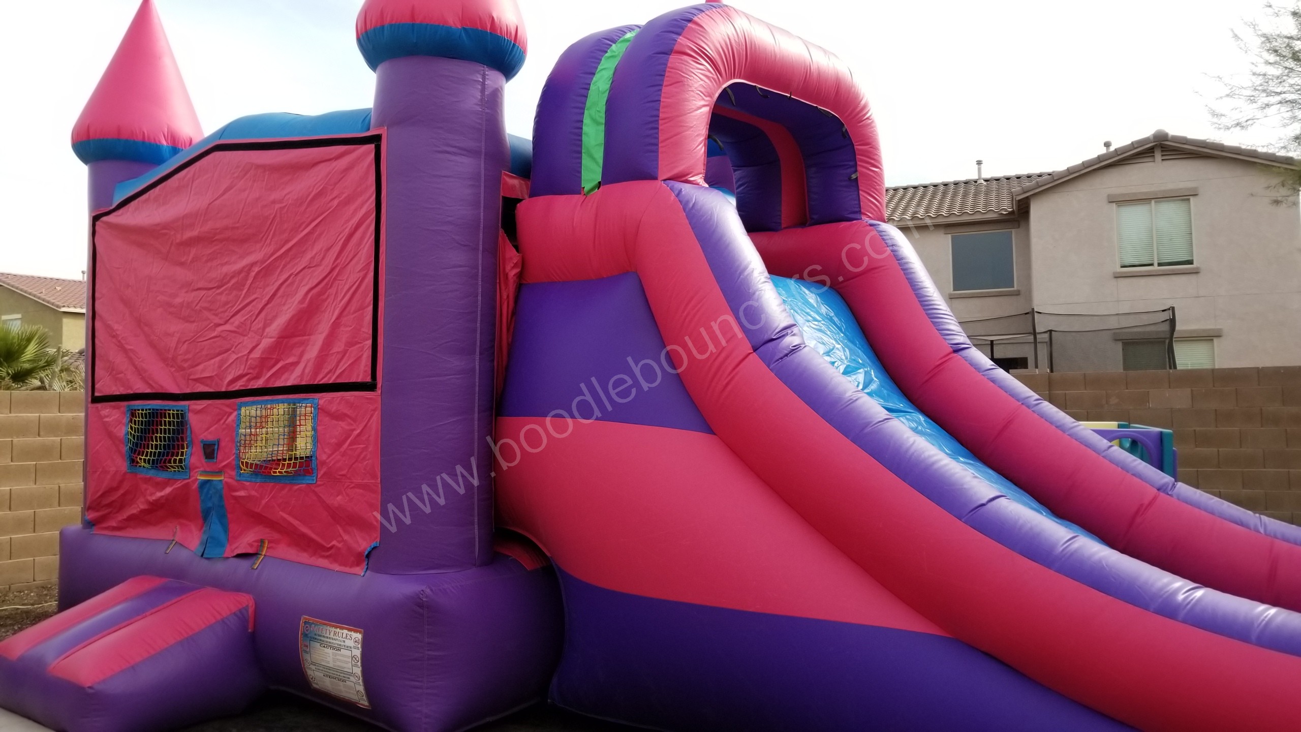 If your favorite colors are pink and purple, this Purple Castle Combo is to be the combo to choose. Kids of all ages will enjoy playing in the 13x13 bounce area. When they are ready to exit the unit, they will climb the ladder and slide down the slide.