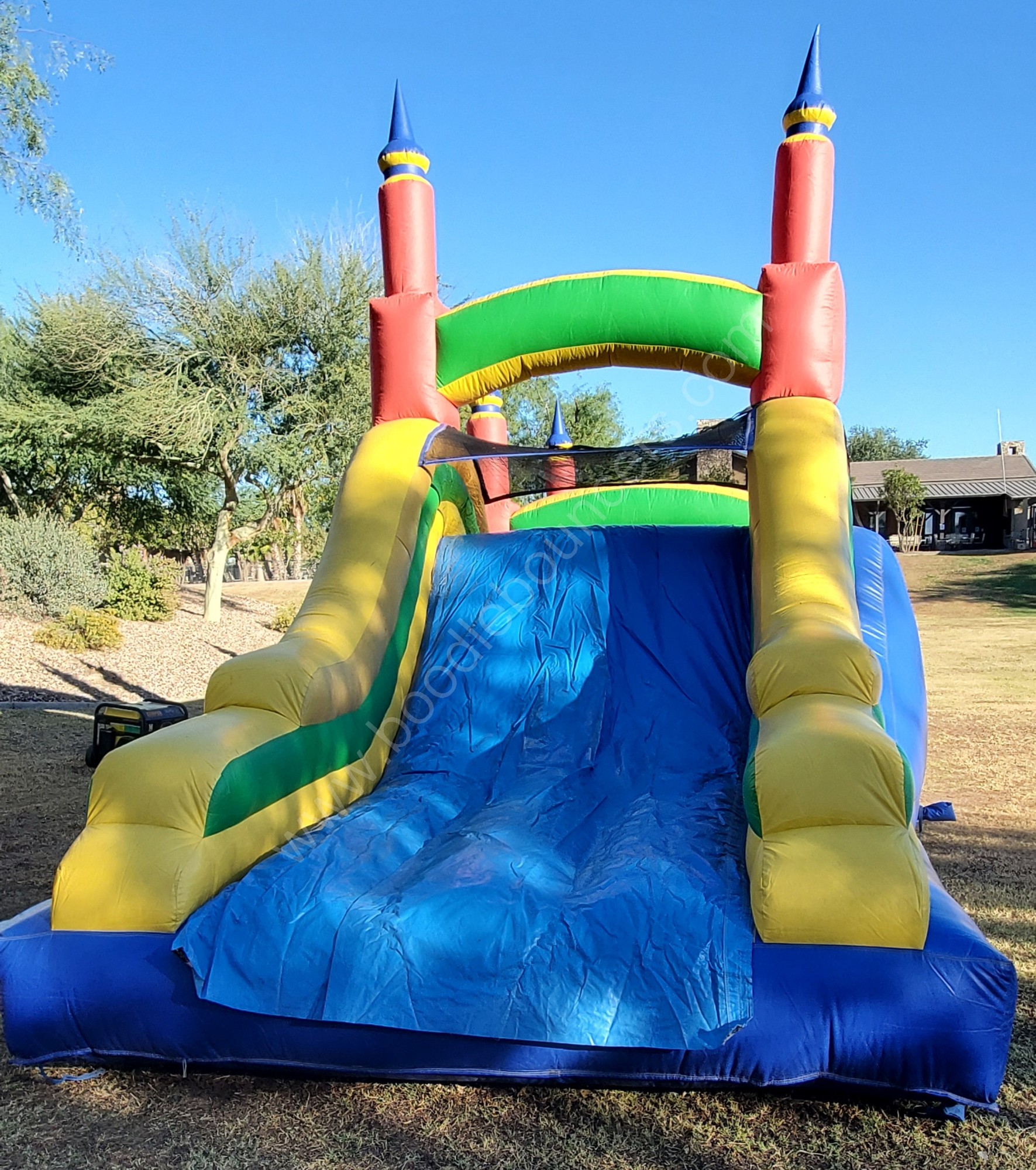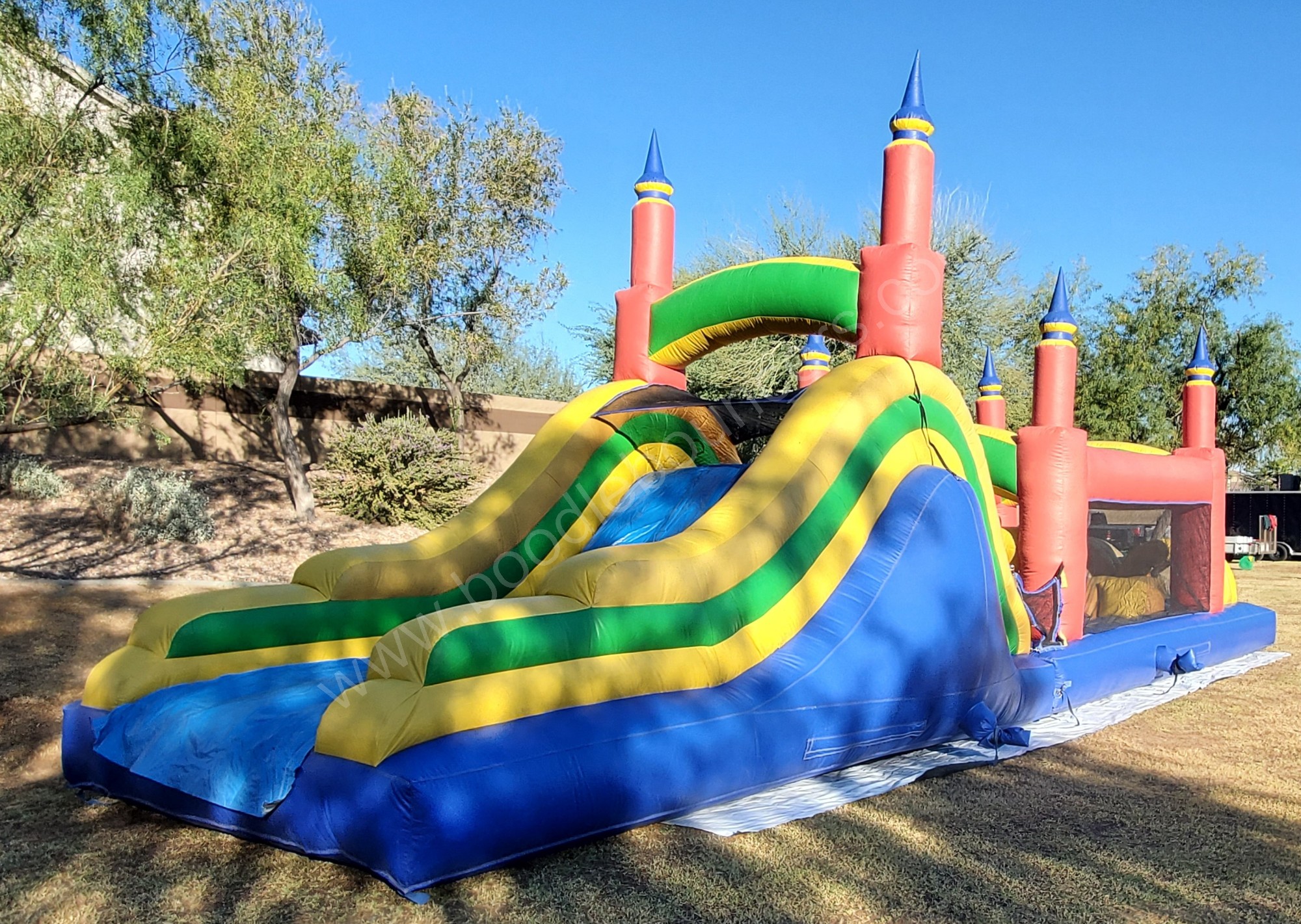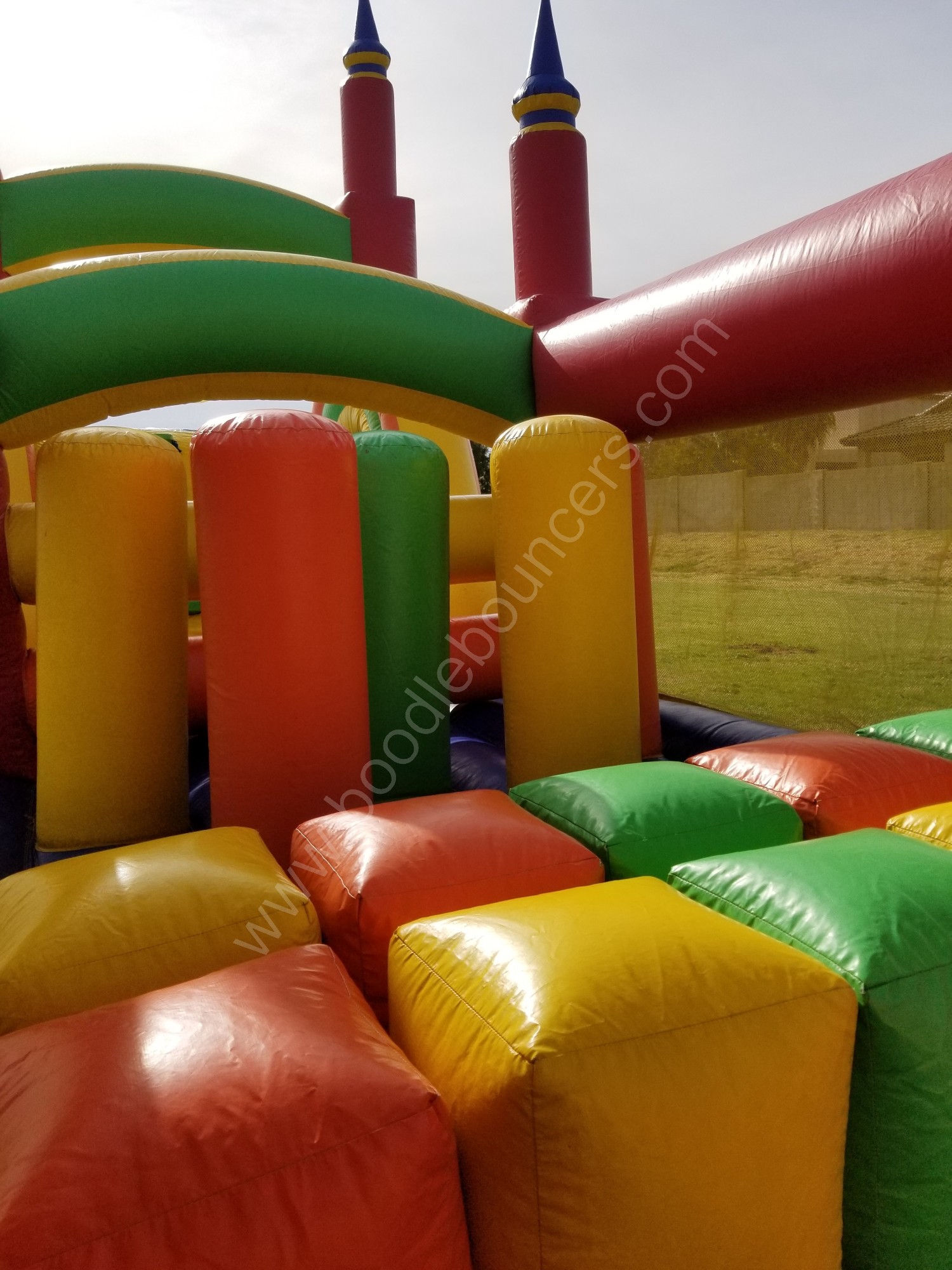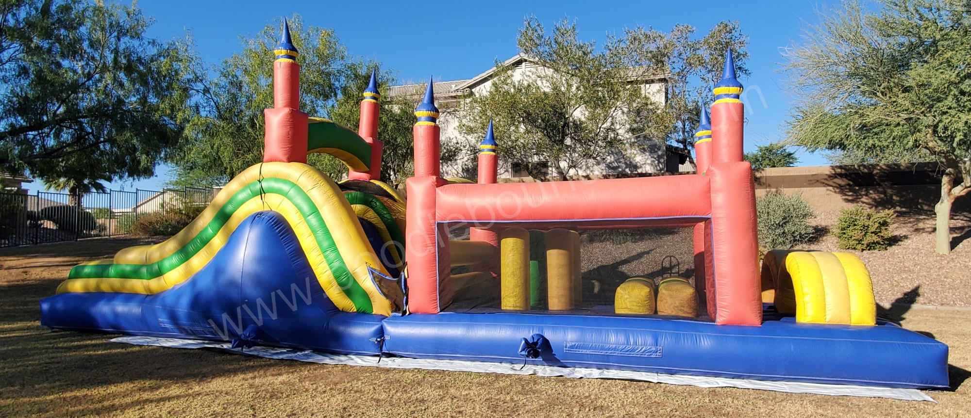 Our 45 foot obstacle course will give you and your guests 45 feet of fun. Complete the obstacle course by yourself or with a an opponent. Enter through the tunnel. Continue by making your way through the obstacle poles. Finish by climbing the ladder and down the slide.