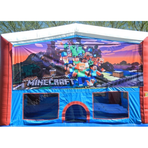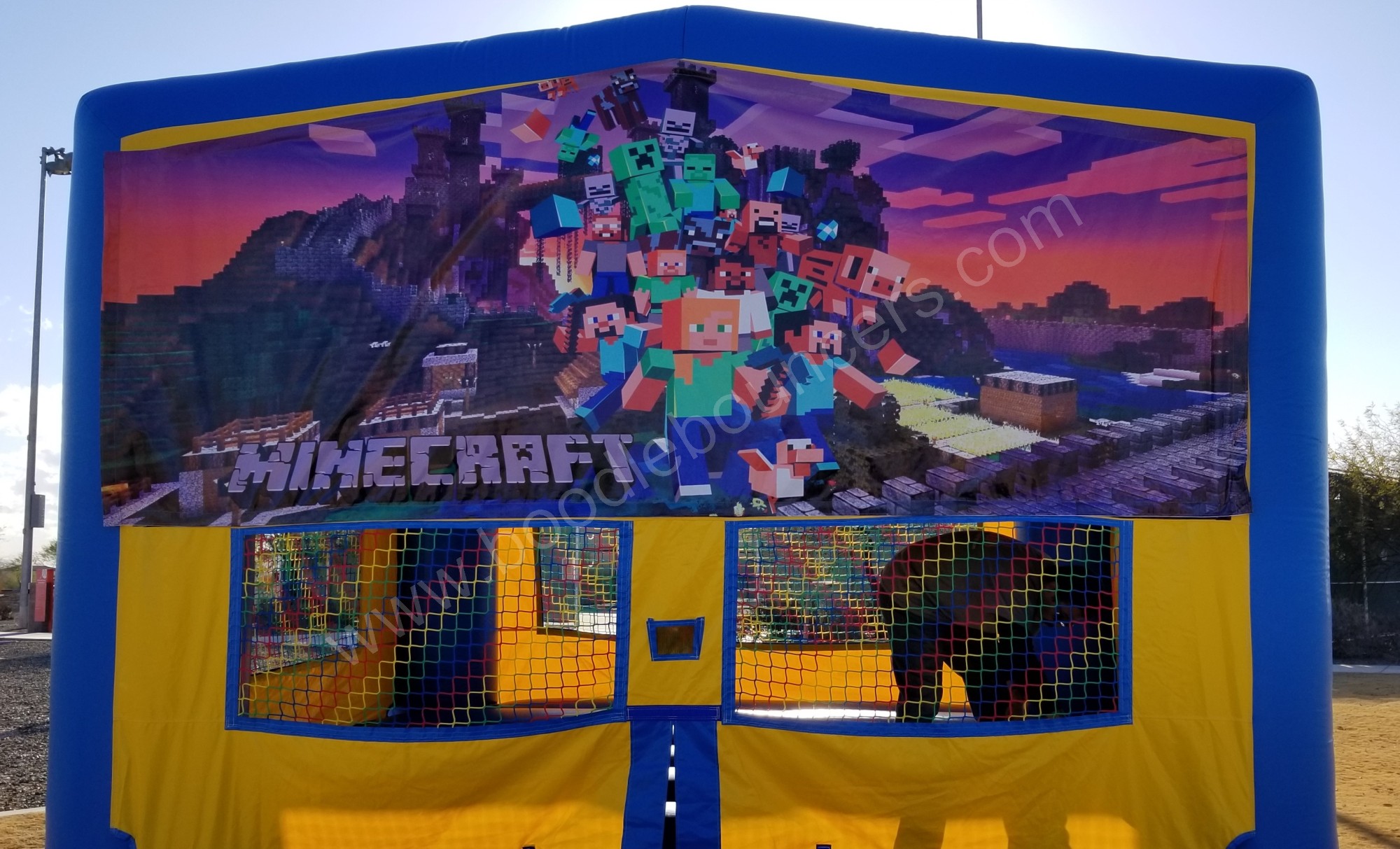Steven, Wolf, Creeper, Blaze, Enterman and friends, are waiting for you to join their journey creating hours of epic fun in the Minecraft panel module house. This 15' x 15' module bounce house also comes with a basketball hoop adding hours of fun to your adventure.