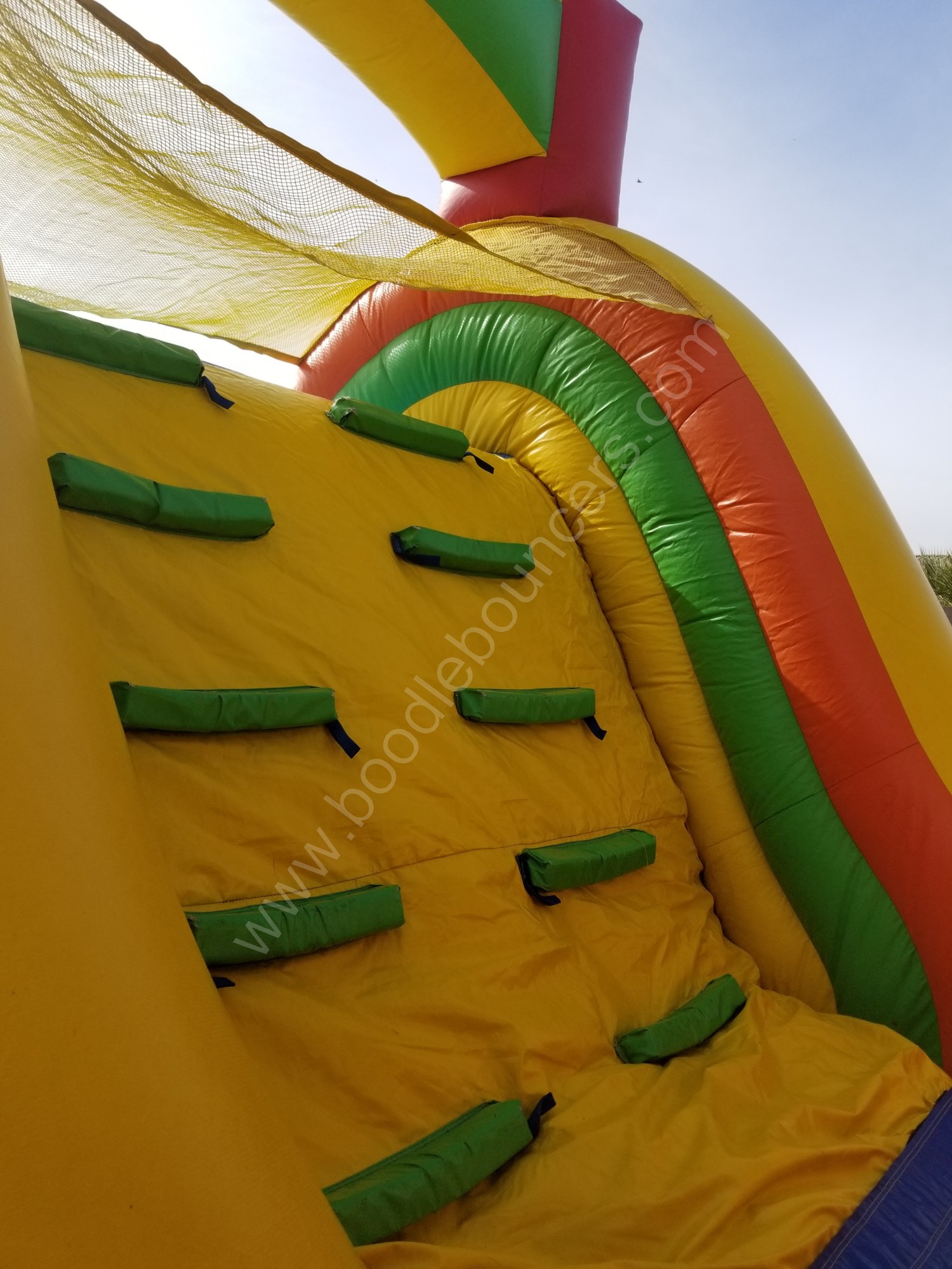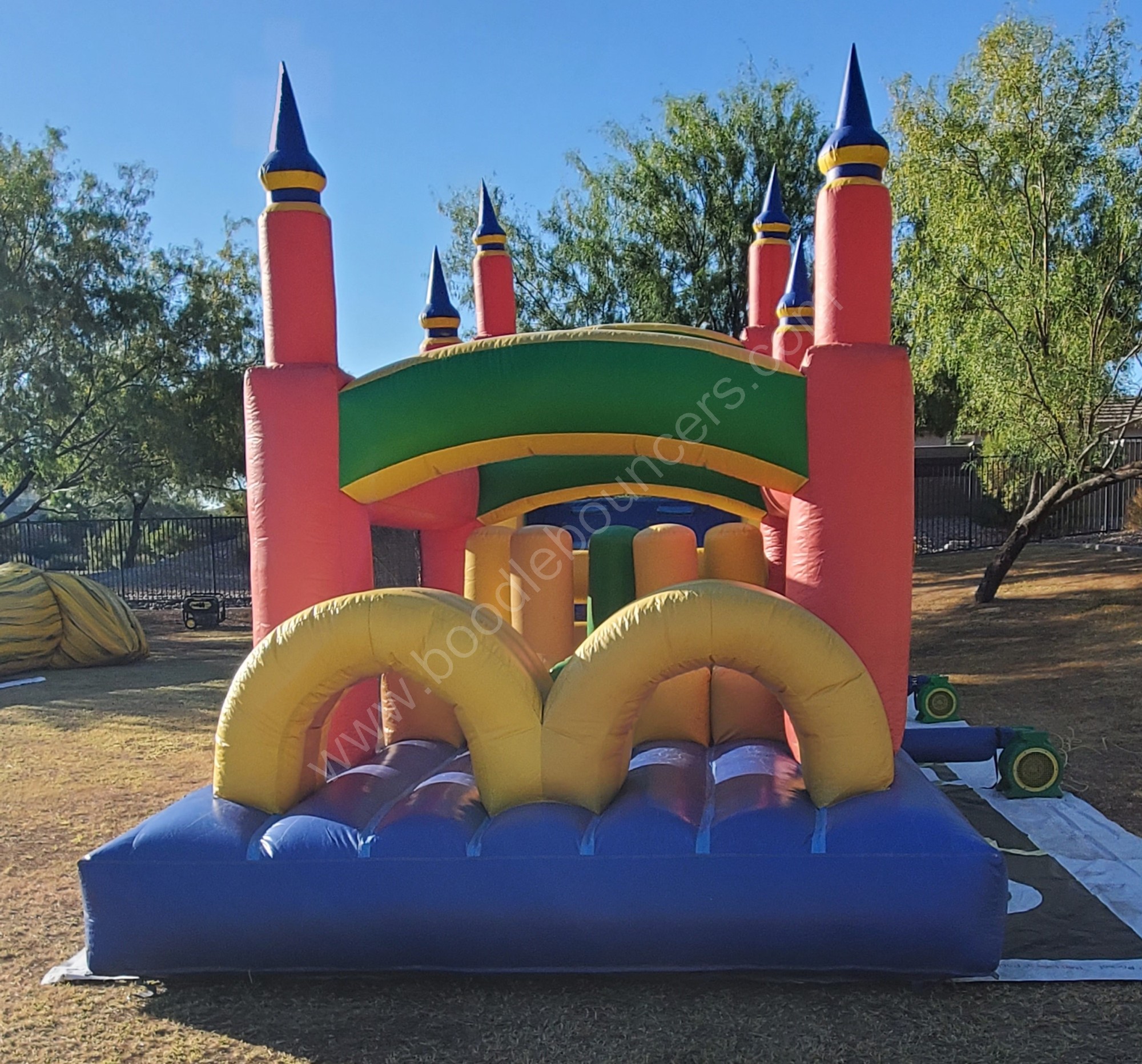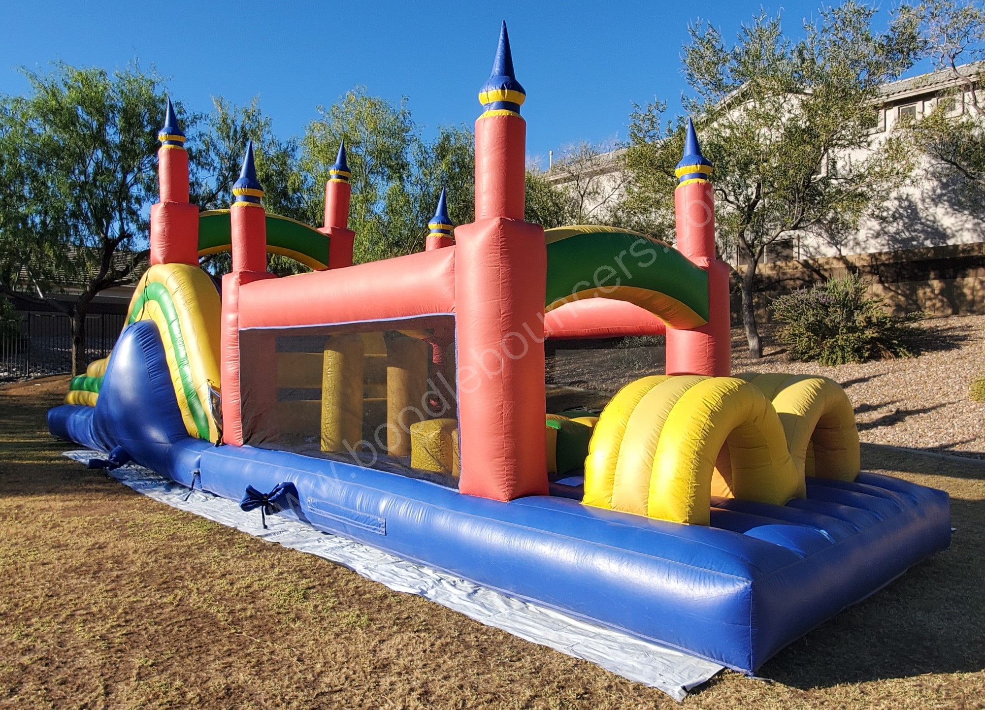Our 45 foot obstacle course will give you and your guests 45 feet of fun. Complete the obstacle course by yourself or with a an opponent. Enter through the tunnel. Continue by making your way through the obstacle poles. Finish by climbing the ladder and down the slide.