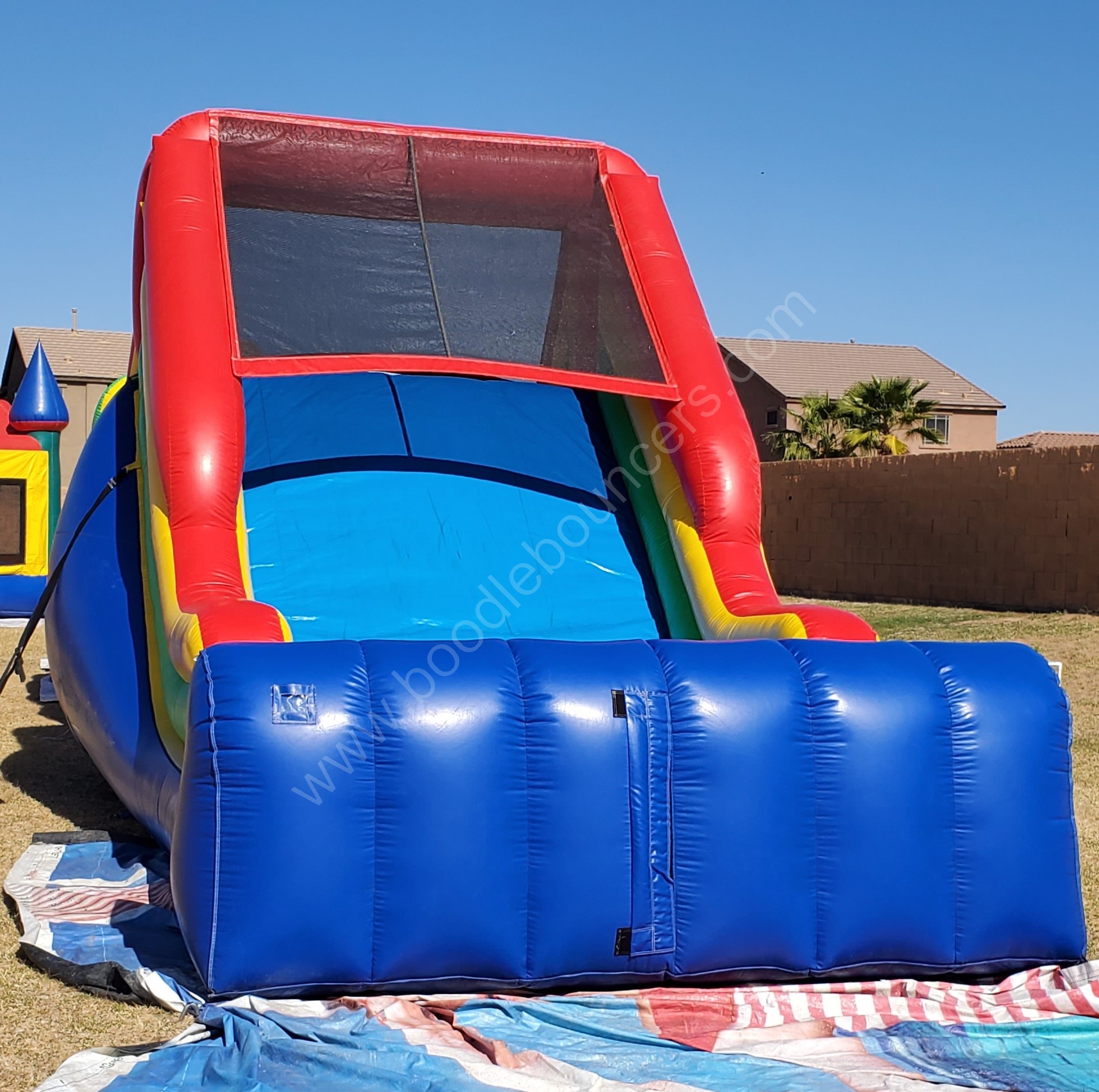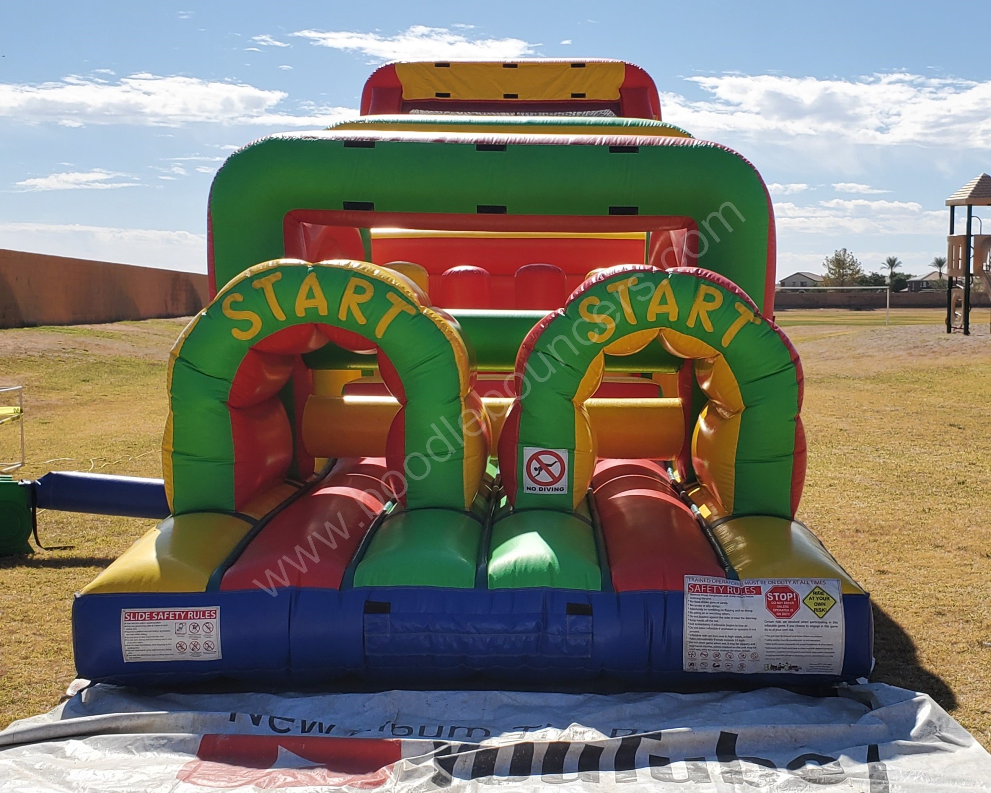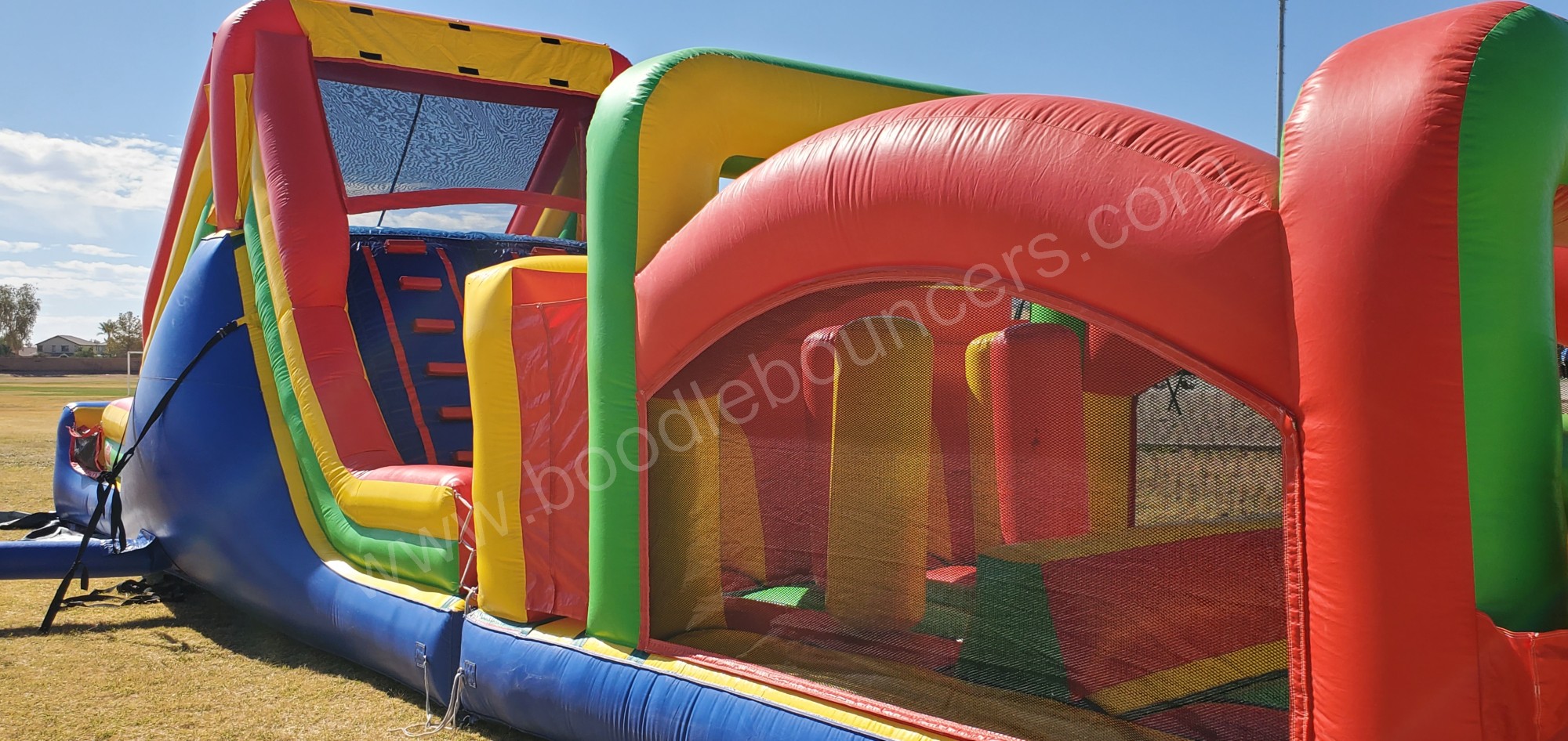 Have some fun in our 50 foot obstacle course. Compete with a friend or by yourself. Enter through the tunnels. Make your way through the obstacle poles. Jump through the circles. Finish by climbing up the slide and down the slide.
