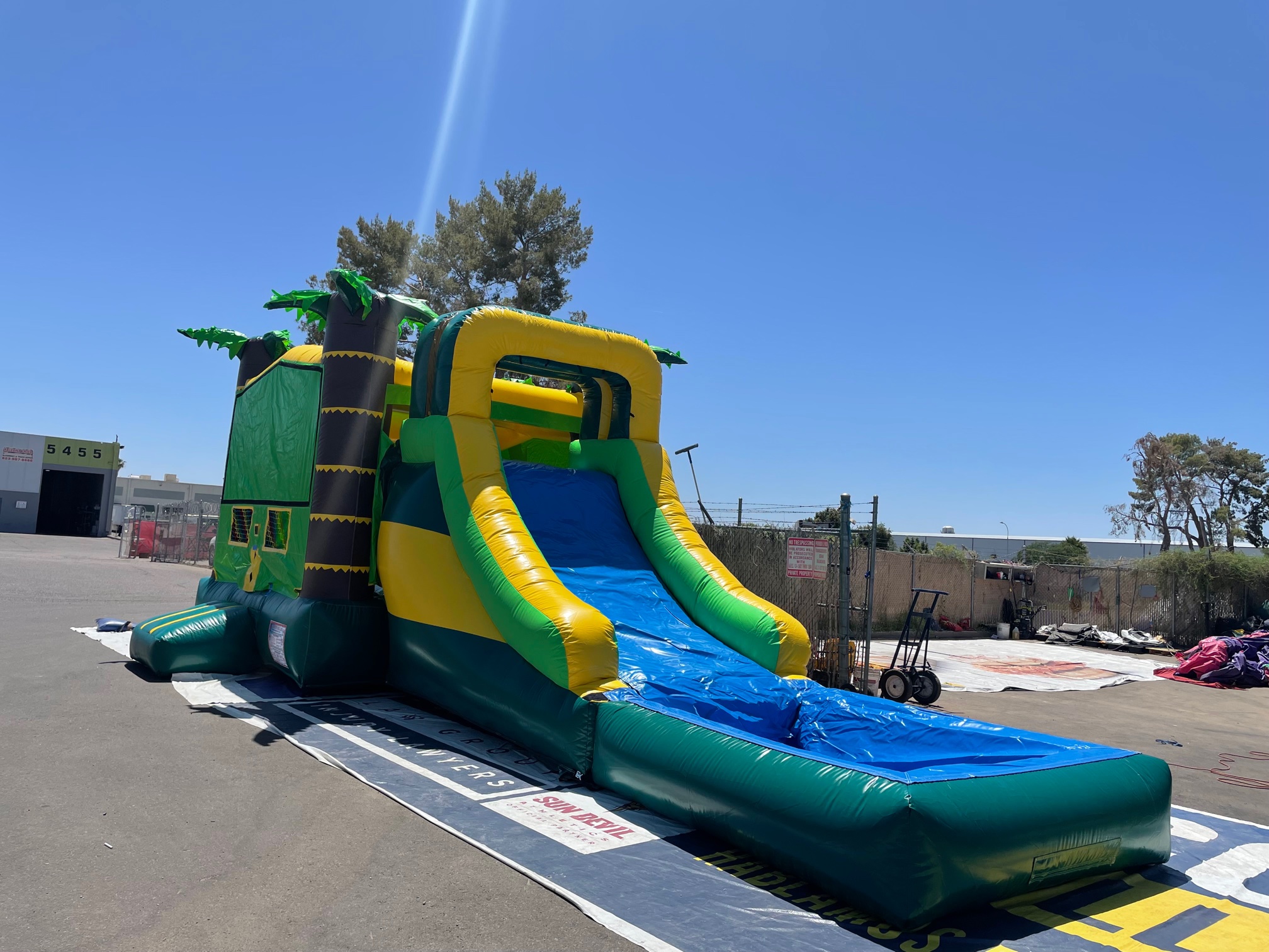 This tropic combo will have you feeling like you are near the beach. Kids will enjoy hours of fun in the bounce area. The bounce area is 13x13. Inside the bounce house is a basketball (not included). When they are ready to exit the unit, they will climb the ladder, down the slide and into a nice pool of water.